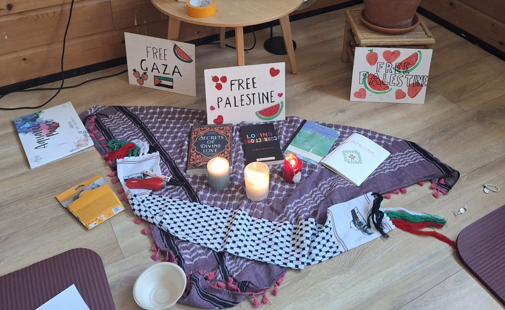 I organise a series of Community Care Days. This is open to anyone aligned with Palestinian liberation, but centred on Muslim and Jewish folks; as our identities are pitted against each other to serve colonial and Zionist agendas. This is a space to disrupt and reject the false narratives increasingly perpetuated by state and media apparatuses that Jewish and Muslim folks are historic and ‘natural’ enemies. It aims to refuse and reject the Zionist narratives through our joy, rest and building solidarity. This is also space to think about what we need- to stay activated and engaged in movements towards collective liberation. In this space we breathe, yoga, write, chat and eat and drink tea. So far there have been two sessions, and I plan for more.